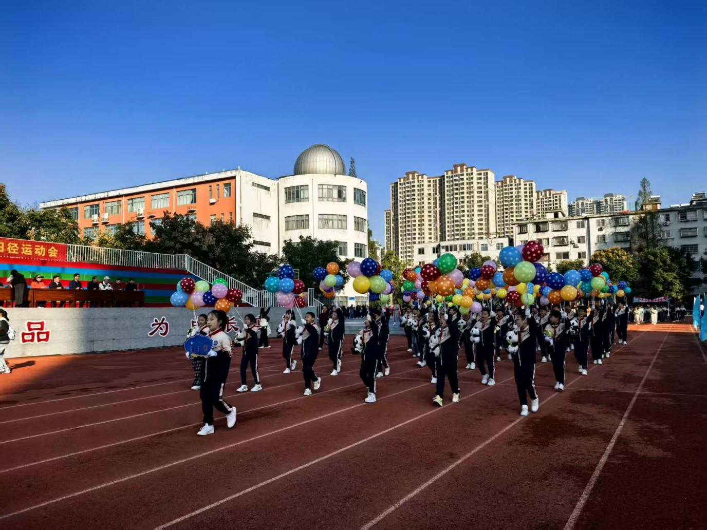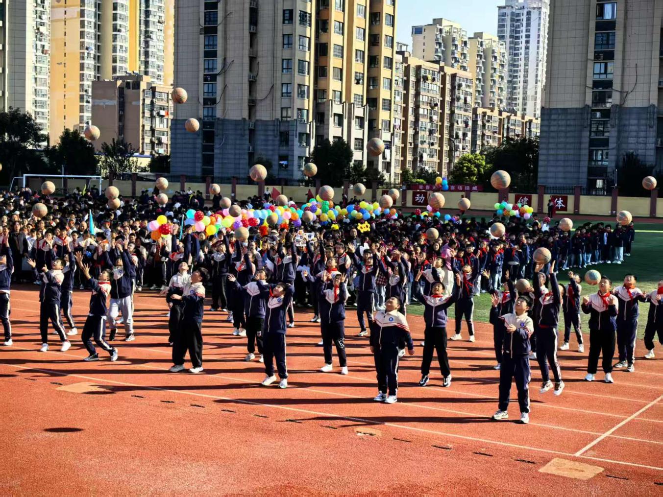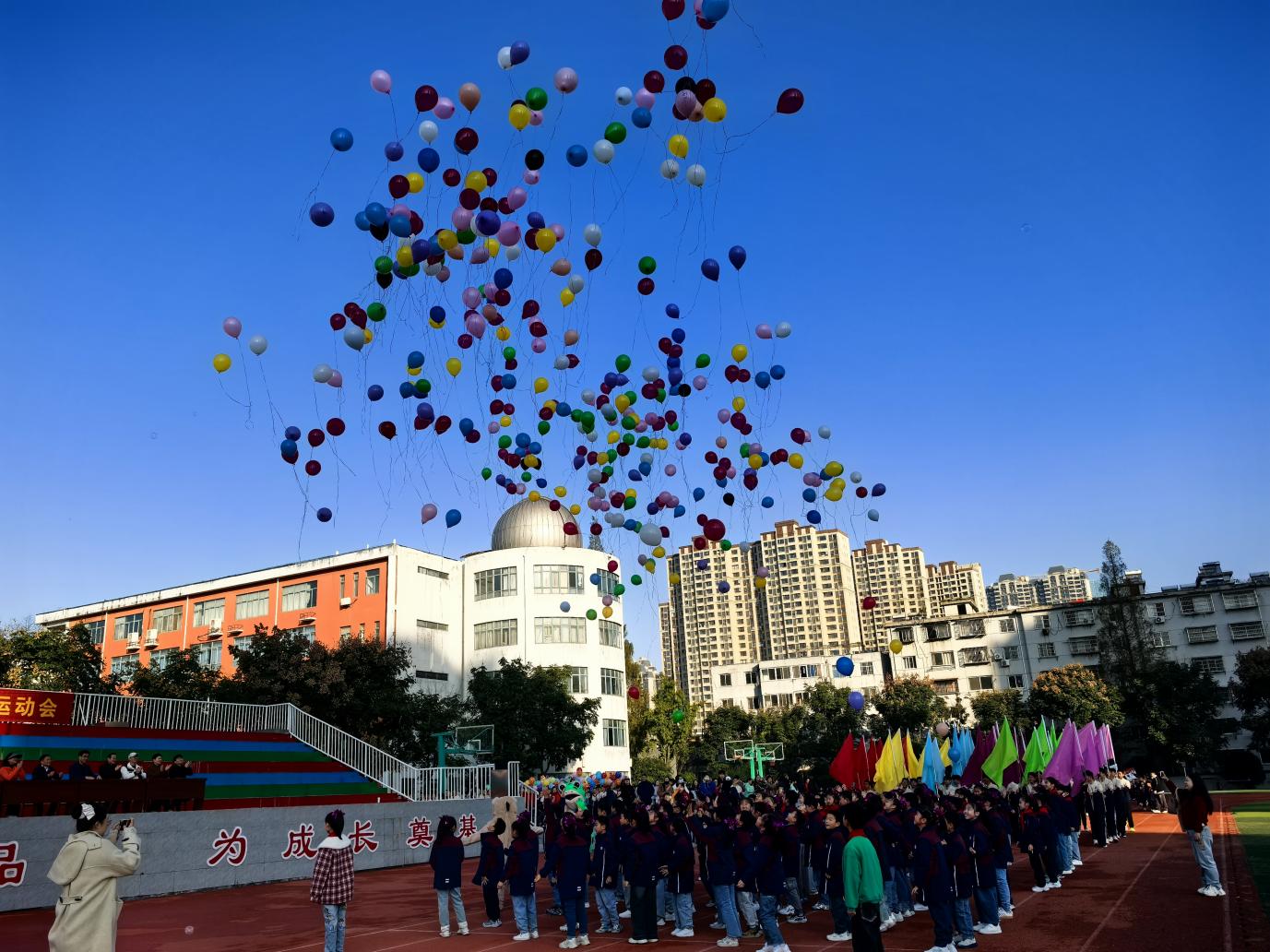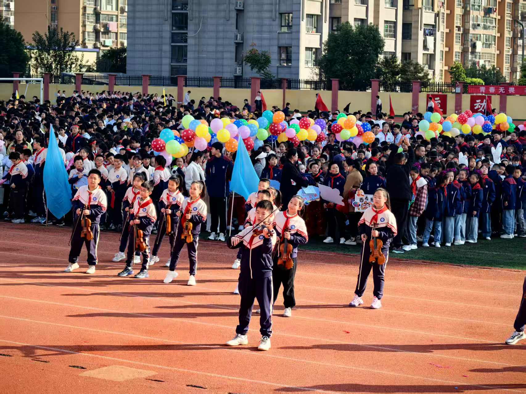 校管乐队的同学们身着蓝色礼服,铜管与鼓乐交织,奏响活力满满的乐章;花环方阵的女生们手捧红黄相间的花束,步伐轻盈,笑容灿烂,如春日繁花般亮眼;鼓号队的鼓点急促有力,号声嘹亮,每一声都激荡着青春的热血。气球队方阵的同学们手牵彩色气球,随着队伍前进缓缓释放,气球带着同学们的心愿升空,成为天空中流动的风景;彩旗队的同学们挥舞着红、黄、蓝、绿各色彩旗,迎风招展,为运动场披上绚丽的 “彩带”。