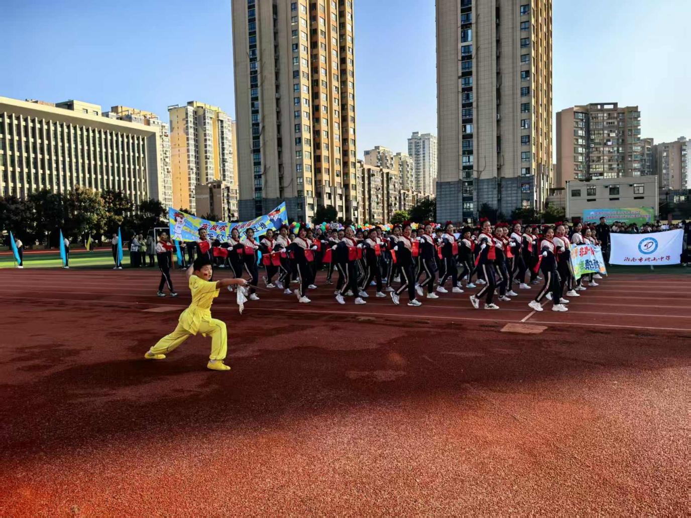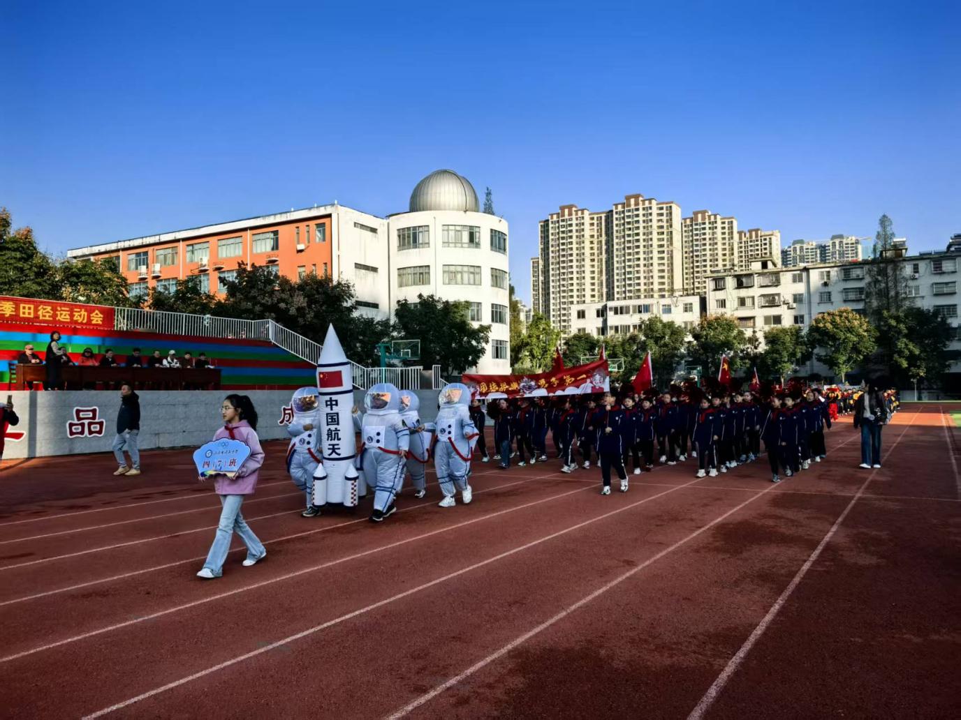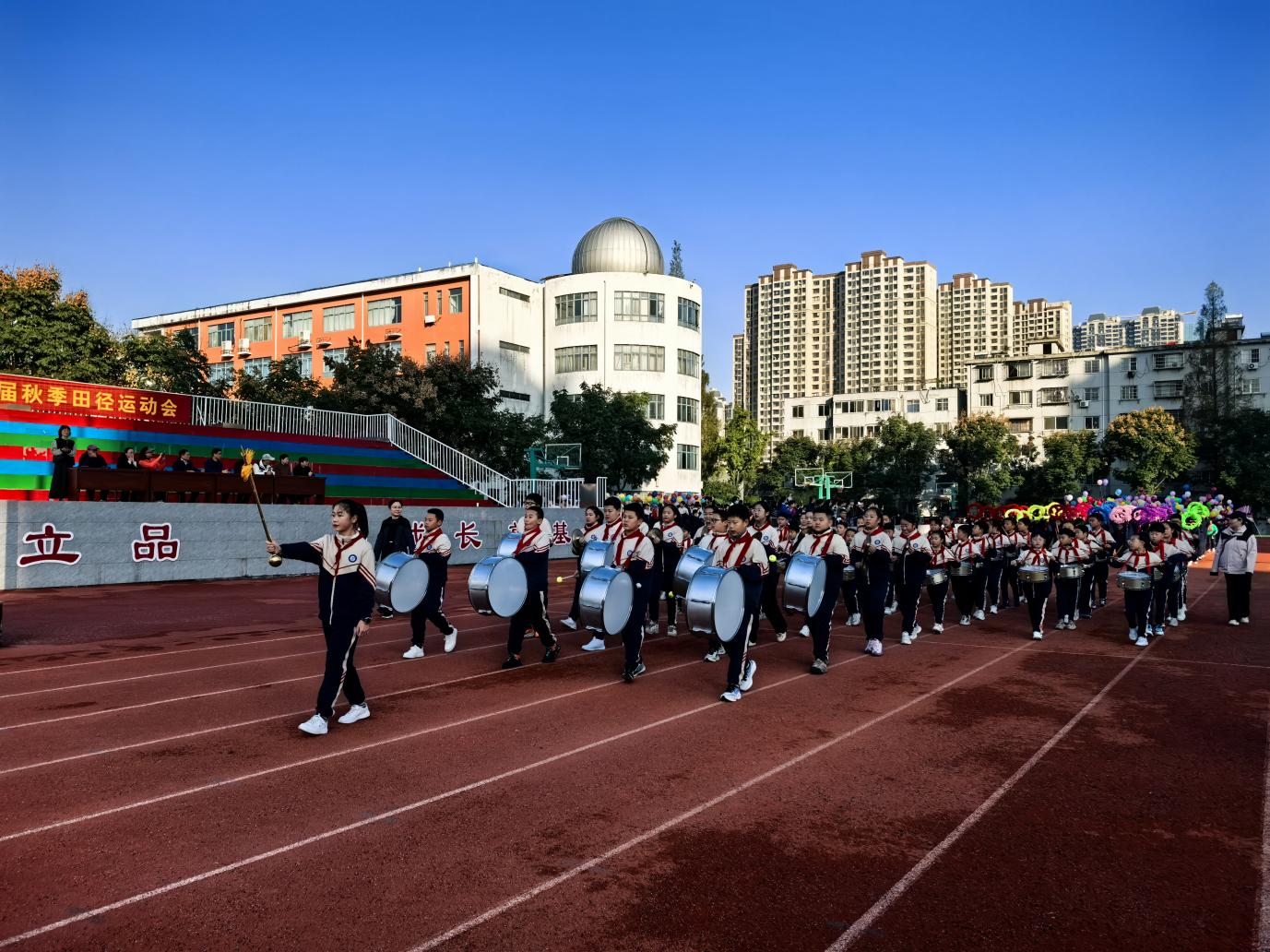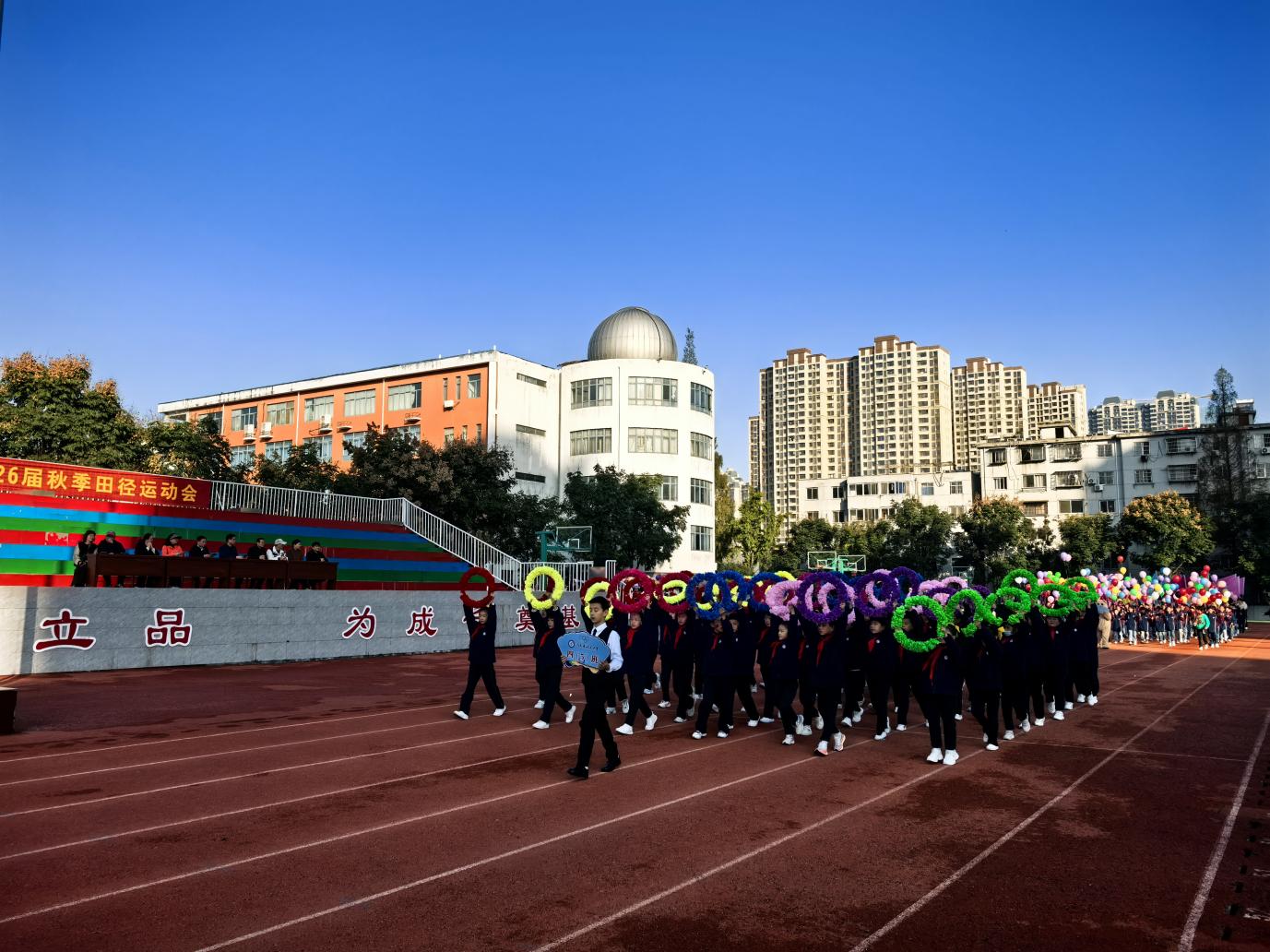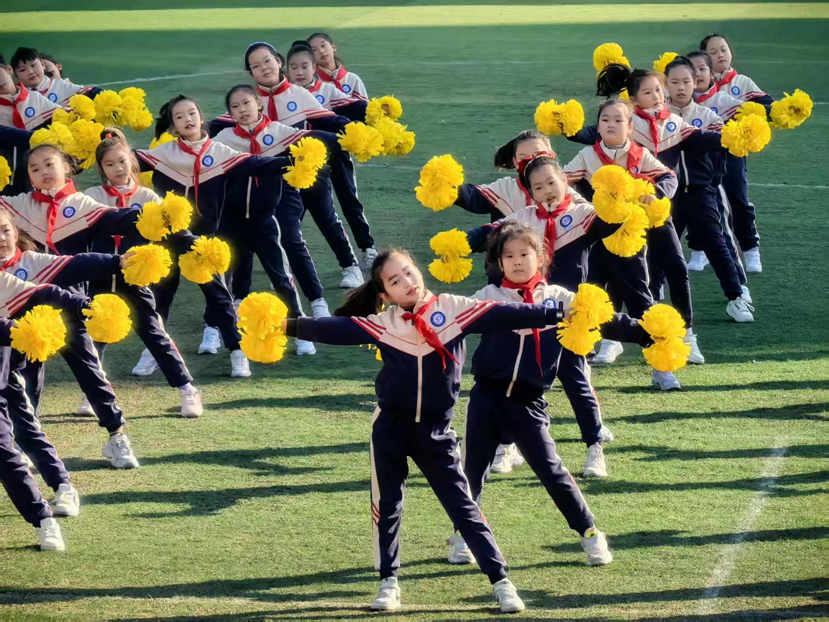 校管乐队的同学们身着蓝色礼服,铜管与鼓乐交织,奏响活力满满的乐章;花环方阵的女生们手捧红黄相间的花束,步伐轻盈,笑容灿烂,如春日繁花般亮眼;鼓号队的鼓点急促有力,号声嘹亮,每一声都激荡着青春的热血。气球队方阵的同学们手牵彩色气球,随着队伍前进缓缓释放,气球带着同学们的心愿升空,成为天空中流动的风景;彩旗队的同学们挥舞着红、黄、蓝、绿各色彩旗,迎风招展,为运动场披上绚丽的 “彩带”。