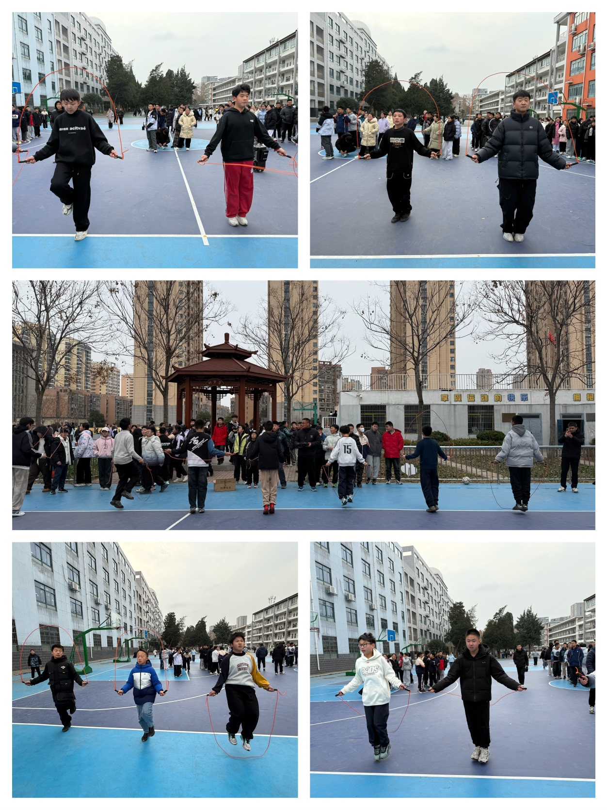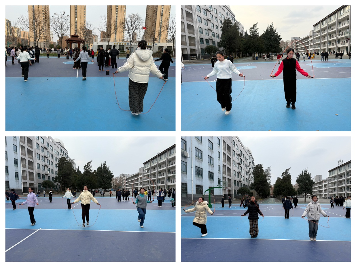 元旦联欢会过后,七年级跳绳比赛在操场热力开赛。随着发令哨响,学子们迅速进入状态,彩色跳绳在空中划出优美弧线。单人跳选手身姿轻盈,双脚交替间尽显速度与节奏感,绳子抽打地面的“哒哒”声紧凑而有力;同学们稳扎稳打,屏气凝神,节奏整齐划一,展现出极强的团队凝聚力。