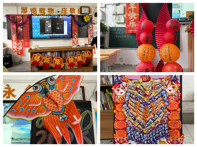 元旦来临之际,各班教室早已被红灯笼、红春联、五彩风筝与吉祥中国结装扮一新,处处洋溢着传统佳节的喜庆氛围与文化韵味,一场场浸润传统文化底蕴、厚植家国情怀的联欢活动热烈上演。魔术表演神秘有趣,纸牌变幻、丝巾消失等桥段引得阵阵惊呼;而更具新意的剪纸魔术,将非遗剪纸技艺与奇幻表演巧妙融合,翻飞的剪刀下,福字、窗花次第显现,让同学们在惊叹之余领略传统手工艺的独特魅力。