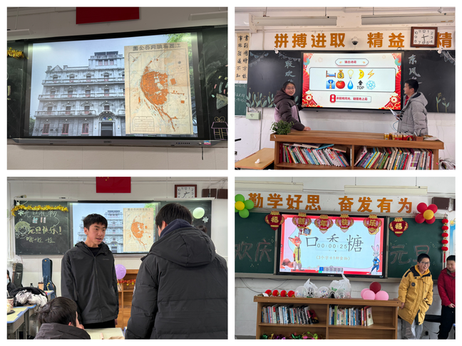 班主任们的倾情参与更添温情,别出心裁的“诗词飞花令”互动环节,师生以“家国”“青春”为题斗诗,妙语连珠间尽显文化底蕴;八(7)班的同学们在班主任李庆明老师的带领之下,完成科学实验——“乒乓球的超能力”,堪称“科学魔法秀”,成为全场最大的惊喜。更有班主任用真挚恳切的新年寄语饱含期许,九(15)班班主任蒋祥聪老师细数过往一学年的成长点滴,勉励学子们以革命先辈为榜样,立鸿鹄之志,践报国之行。活动的最后,七(9)班全体师生齐声合唱《歌唱祖国》,激昂的旋律响彻教室,铿锵的歌声传递着拳拳爱国之心,师生们眼神坚定、饱含深情,将对祖国的热爱与对新年的憧憬,融入每一句歌词之中。这一刻,班级的凝聚力与师生的家国情怀,在歌声里凝聚升华。